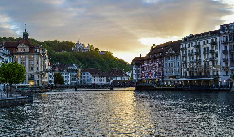 罗伊斯河穿城而过,石桥横跨两岸,左侧是色彩斑斓的木结构老屋,右侧为典雅巴洛克建筑;远山城堡山上的小教堂在霞光映衬下轮廓分明,展现卢塞恩独特的历史空间层次。