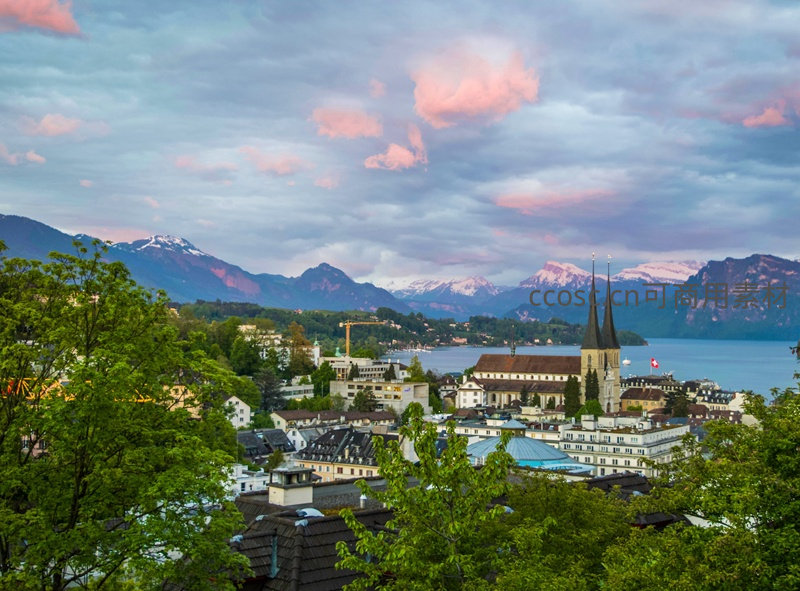 粉霞映照下的卢塞恩全景,双尖塔教堂与雪峰湖水相映成趣