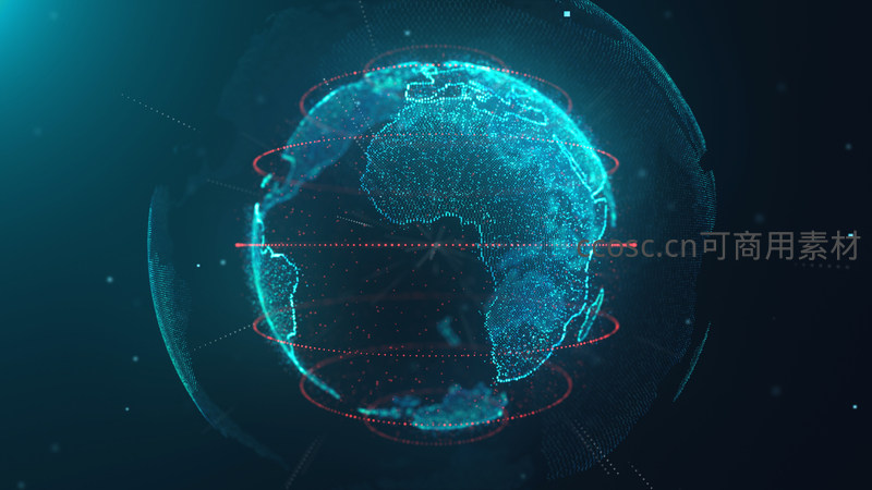 由无数光点构成的数字化地球模型,红色数据流环绕其上,象征着全球化时代信息与技术的无缝连接。
