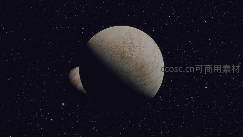 深空背景下木星与冰封卫星欧罗巴并列,展现太阳系神秘天体与人类对宇宙探索的无限遐想。