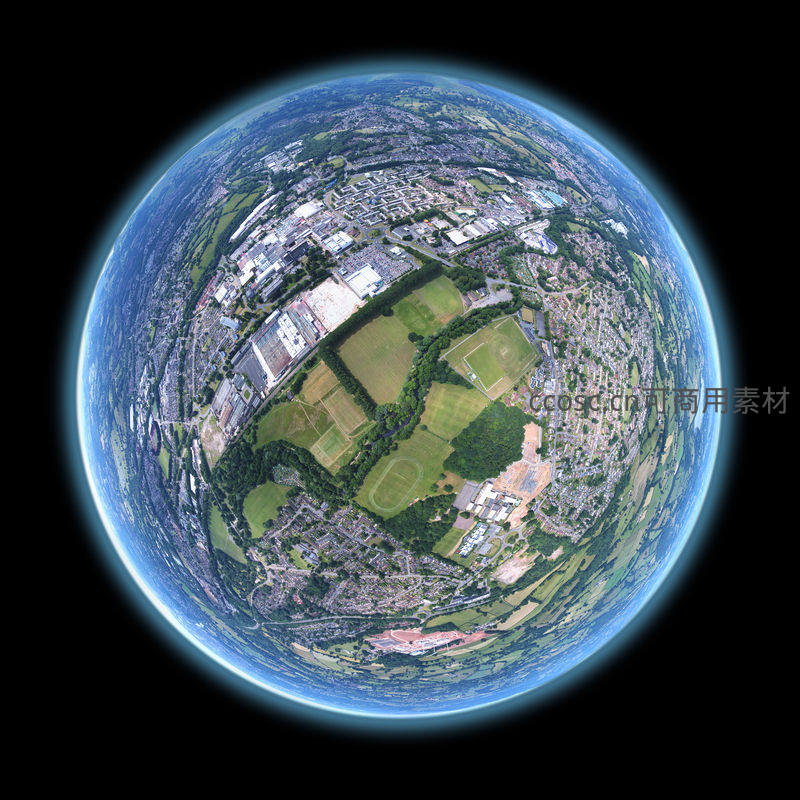 通过鱼眼镜头将城市景观压缩成一个微缩星球,展现人类聚居地与自然环境交织的奇妙视觉效果。