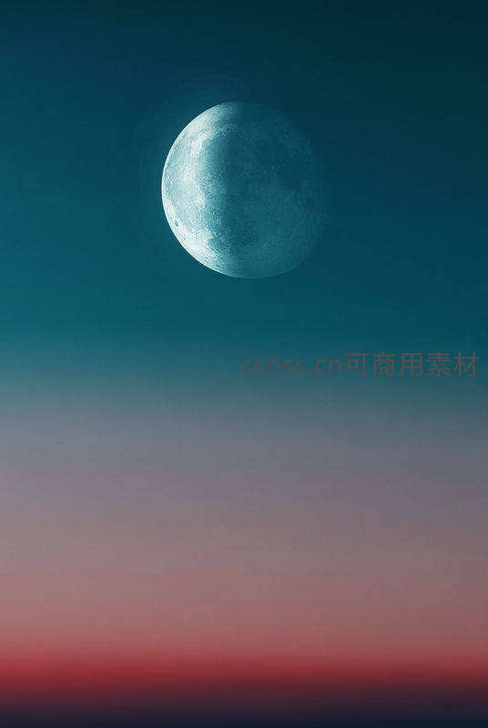 一轮明月悬挂在由深蓝到粉红渐变的暮色天空中,营造出一种宁静、唯美且富有诗意的视觉氛围。