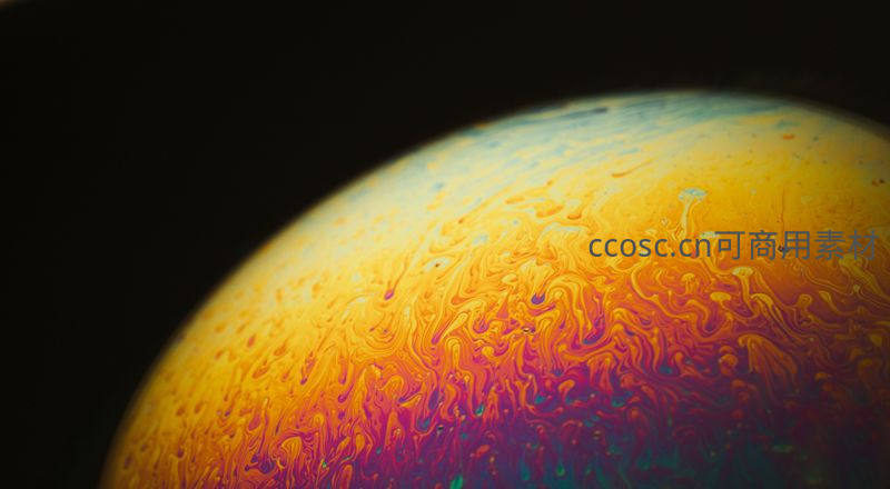 微距镜头下,肥皂泡薄膜上流动着如油画般绚烂的虹彩,黄、橙、紫、蓝等色彩交织变幻,展现出微观世界的奇幻之美。