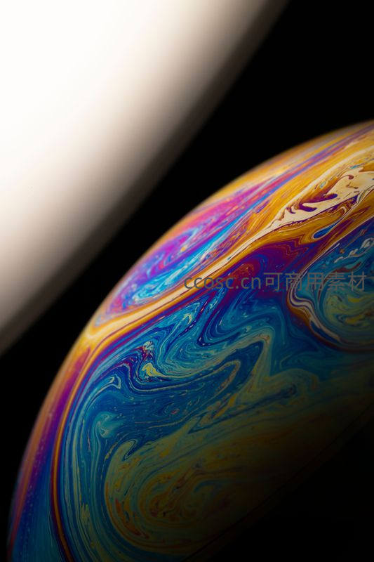 特写镜头捕捉肥皂泡边缘,斑斓色彩如星云般旋转流动,蓝色、紫色、金色交融,营造出迷幻而精致的视觉效果。