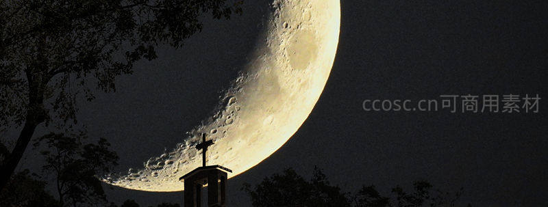 一弯明亮的新月优雅地悬挂在夜空,其下方是教堂钟楼的黑色剪影,十字架轮廓清晰,营造出神圣而宁静的氛围。