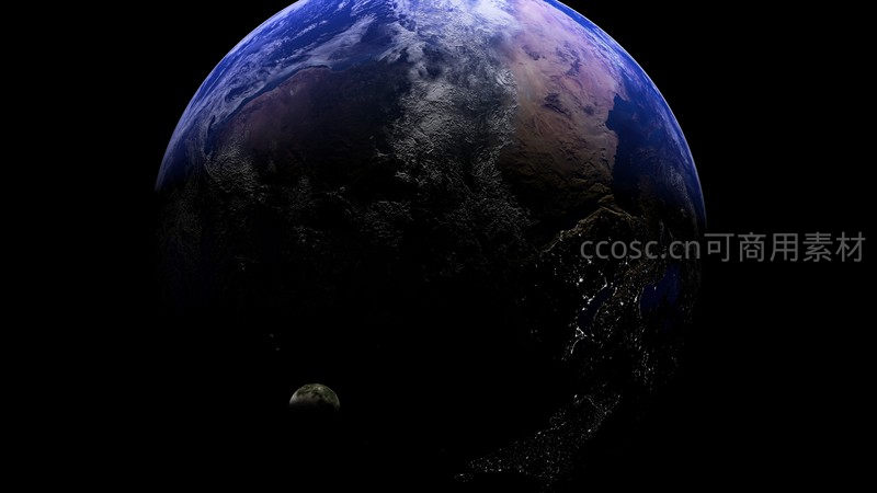 从太空俯瞰,地球的璀璨城市灯火与宁静月球形成鲜明对比,展现人类文明与自然天体的和谐共存之美。