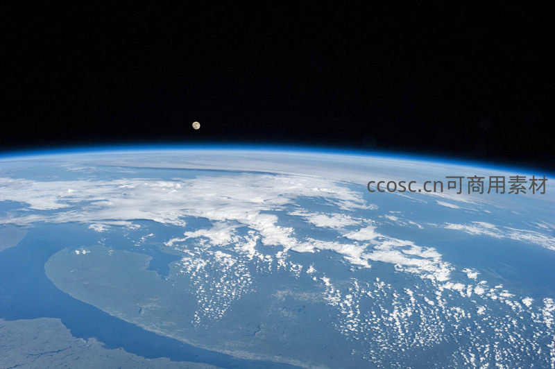 从太空视角看,月球如明珠般悬挂在地球弧线上方,蓝色大气层与白色云朵环绕,构成天地共舞的宇宙奇景。