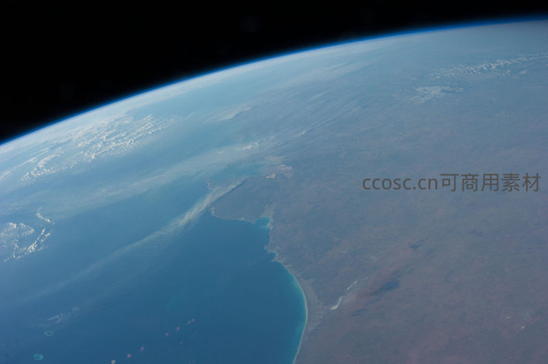从太空俯瞰地球,蓝色海洋与陆地交界,大气层薄如轻纱,展现星球的宏伟与脆弱。