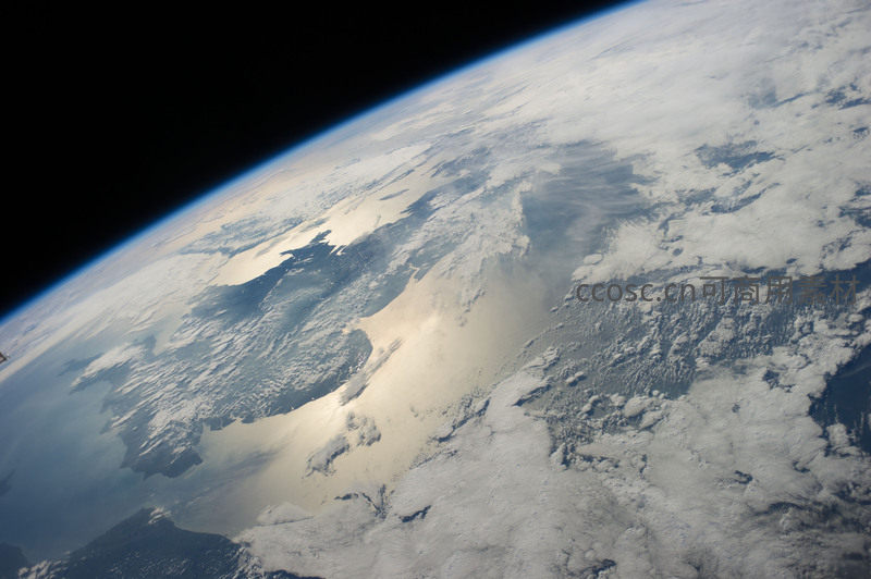从太空俯瞰极地广袤的冰盖,阳光照射下云影斑驳,冰面反射出耀眼光芒,展现地球极端环境的独特魅力。