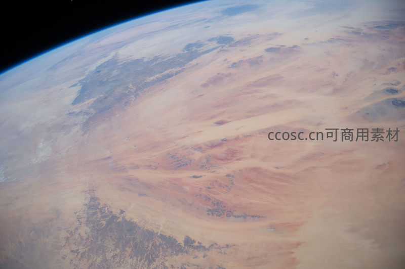 从轨道高度拍摄的地球表面,展现了广袤无垠的沙漠地貌与清晰的星球弧线,云层稀薄,尽显苍凉壮美。