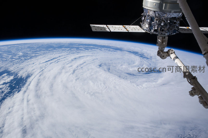 国际空间站的机械臂悬于画面一角,下方是正在肆虐的巨型气旋,其螺旋结构清晰可见,令人震撼于自然之力。