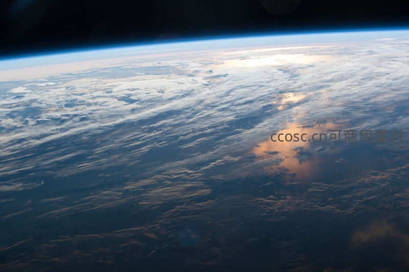 夕阳余晖染红云层,金色光芒在地球弧线上流淌,云海如绸缎般铺展,营造出梦幻而宁静的宇宙黄昏画卷。