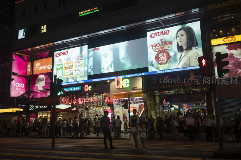 重庆大厦夜景全景:广告矩阵与都市行人剪影