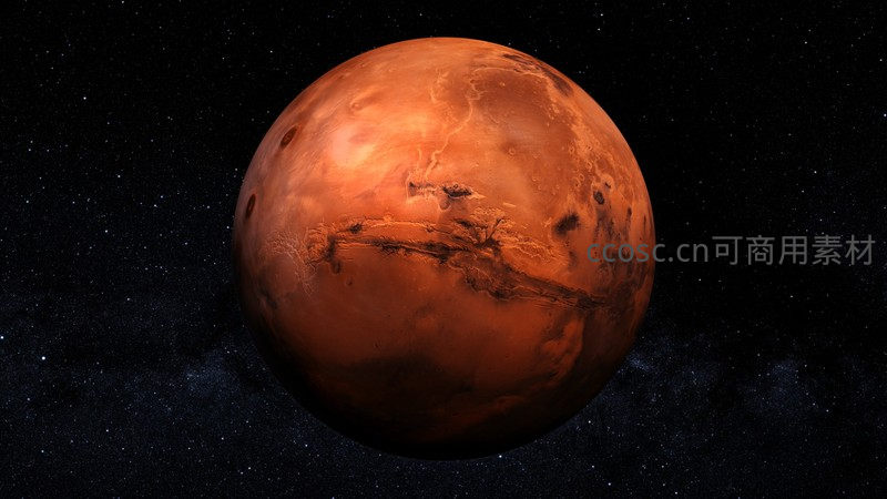 火星的完整球体悬浮于繁星背景前,其标志性的赤红色地表、峡谷和陨石坑清晰可见,展现其古老而荒凉的面貌。