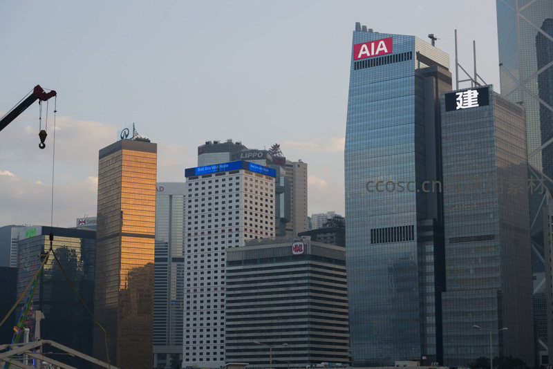 香港中环核心区高楼林立,AIA中央广场红色标识醒目,建银大厦‘建’字清晰可见;左侧施工吊臂悬垂,映衬城市持续更新的动态;暖色调夕照为玻璃幕墙镀上金边,彰显国际金融中心的繁华与活力。