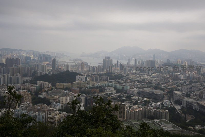 镜头自山顶向下俯拍,前景枝叶掩映,中景密集住宅与商业楼宇错落分布,远景维多利亚港及对岸九龙隐约可见,整体笼罩于薄雾之中,呈现宁静而厚重的城市呼吸感。