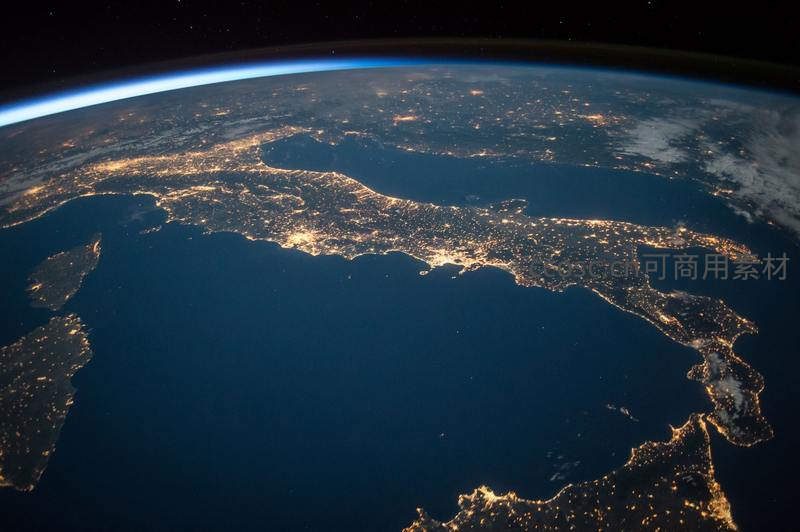 从太空俯瞰夜晚的意大利半岛,璀璨的城市灯光勾勒出陆地轮廓,与深邃海洋和星空形成壮丽对比。