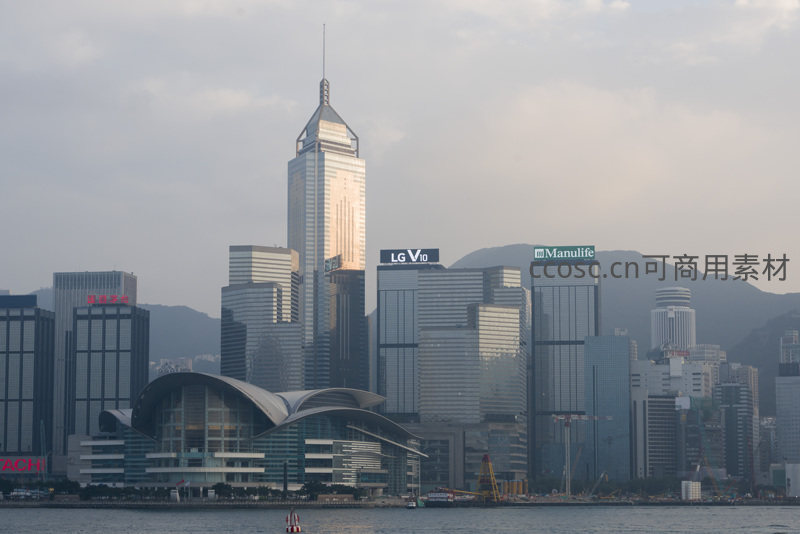 清晨薄雾笼罩下的香港维多利亚港,中银大厦以其独特几何造型矗立中央,周边环绕LG、Manulife等企业总部大楼,远处山峦隐约可见,水面船只缓缓穿行,展现国际都市的繁华与宁静交融。