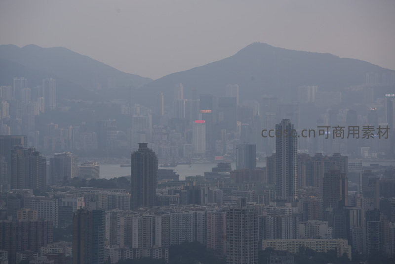 雾霭中的香港城市天际线,高楼林立与远山相映成朦胧画卷