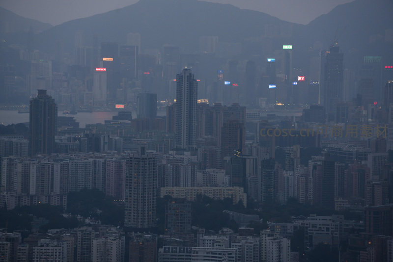 高处俯瞰港岛中环至湾仔一带,薄雾尚未散尽,部分写字楼与商场已亮起红色、蓝色广告牌与标识灯;密集塔楼群在灰蓝背景下形成光影层次,山体轮廓勾勒天际线,展现国际都会从日落到入夜的瞬息变幻。