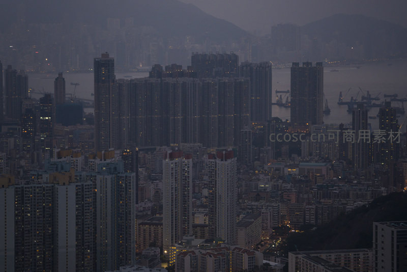 密集公屋群映衬维港夜色,山脚楼宇层层叠叠,展现香港独特居住形态