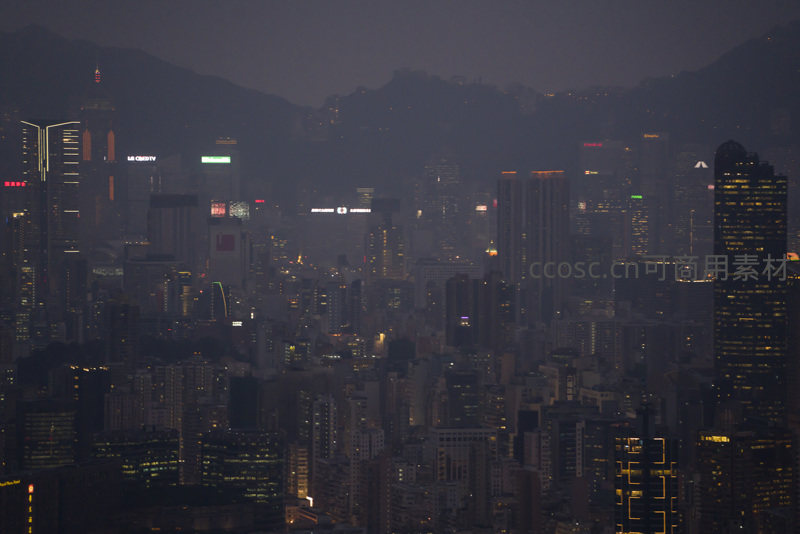 聚焦香港核心商务区夜景,汇丰银行、中银大厦等标志性建筑在薄雾中透出点点光斑,密集楼群形成垂直森林般的视觉冲击;远处山体轮廓隐约,近处楼宇窗灯如繁星密布,展现超大城市夜晚的生命力与秩序感。