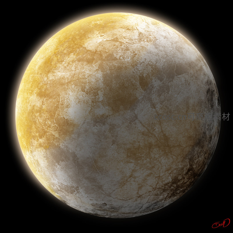 一颗布满裂纹和沙丘的金色行星,在黑暗中散发着温暖而孤寂的光芒,仿佛是失落文明的遗迹。