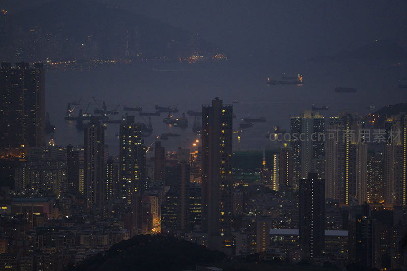 从高处俯瞰维港东侧夜景,货轮与起重机在朦胧水面上作业,密集住宅与商业楼宇灯光错落有致;暖黄与冷白光交织,映照出国际航运枢纽与居住区共生的城市肌理与活力。