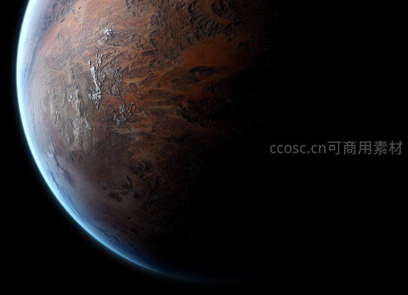 从轨道上捕捉到的火星边缘,红色的地表与稀薄的大气层形成鲜明对比,展现其荒凉而壮美的地貌。