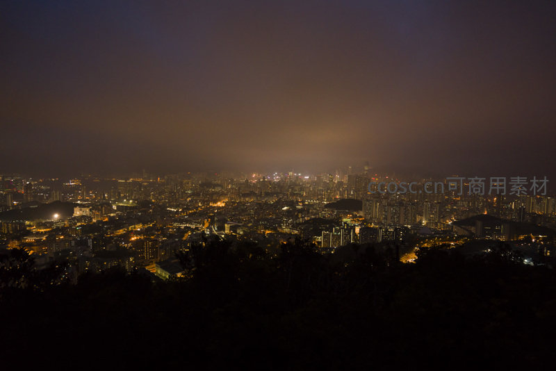 取景自太平山顶观景点,视野开阔无遮挡,近处树影为前景框架,中远景是密布灯海的港岛与九龙,天际线在微光云层下层次分明,凸显香港作为世界级滨海都市的独特地理与视觉魅力。