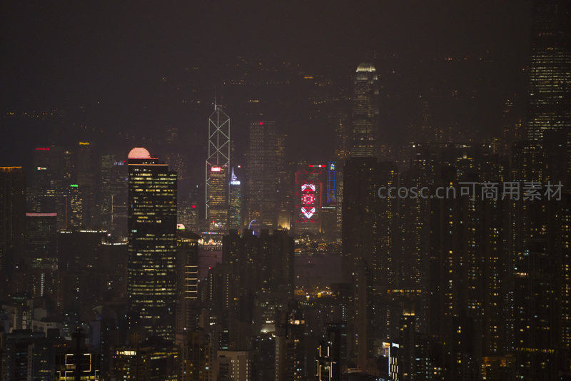维港两岸摩天楼群夜景特写,中银大厦与广告屏交相辉映