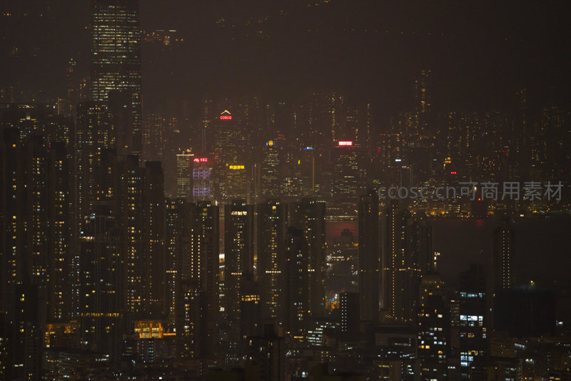 雾霭中的香港天际线夜景,COSCO等企业标识在楼顶熠熠生辉