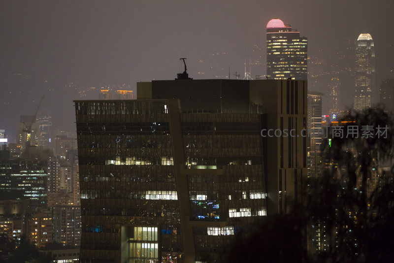 聚焦一栋现代风格办公楼夜景,不规则几何立面在灯光下呈现明暗交错,顶部起重机轮廓清晰;背景中中环地标如中银大厦隐约可见,前景树影虚化增添景深。