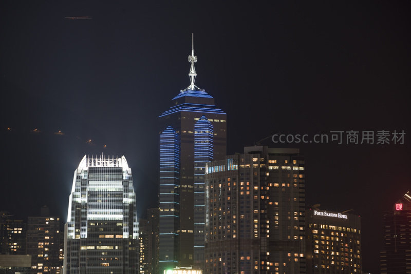 中环夜色尖沙咀方向高楼林立蓝光装饰熠熠生辉