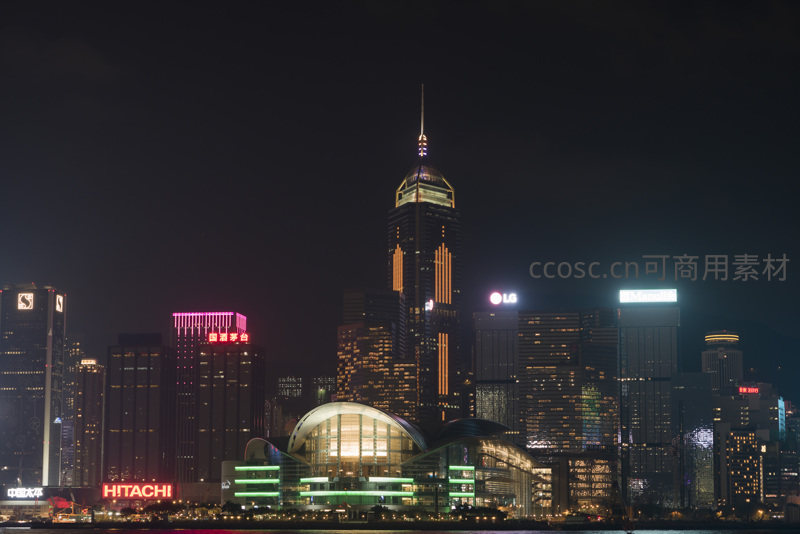 夜幕下的香港维多利亚港两岸灯火辉煌,中银大厦尖顶闪耀,香港会议展览中心弧形屋顶泛着绿光,远处高楼群星点点,水面倒映流光溢彩,展现国际都市繁华与现代建筑美学的完美融合。