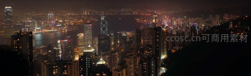 超宽幅视角呈现香港夜景全景长卷,从太平山延伸至九龙半岛,维港如玉带贯穿,两岸高楼林立、灯光璀璨,山体暗影与城市亮区形成强烈对比,展现世界级都市依山傍海的独特地理格局与夜间魅力。