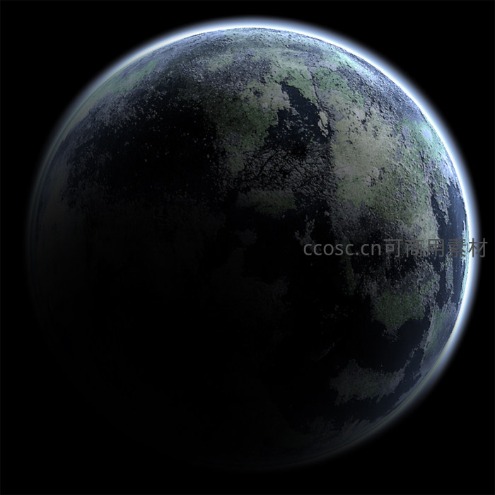 一颗被黑暗笼罩的星球,其表面隐约可见绿色植被与崎岖地貌,边缘泛着微光,仿佛在无声诉说着宇宙深处的秘密。