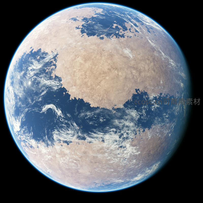 从太空视角看去,广袤无垠的棕色沙漠与深邃的蓝色海洋形成鲜明对比,白色云层翻滚其间,展现了地球地貌的壮阔与多样性。