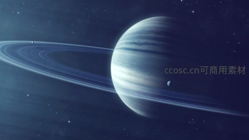 在冷峻的蓝色宇宙背景下,土星与它的卫星静静相伴,环带泛着微光,营造出一种超现实的宁静美感。