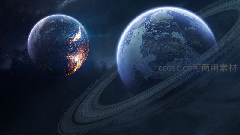 两颗风格迥异的行星在黑暗太空中并列,其中一颗环绕着巨大光环,形成冷暖色调与文明想象的强烈碰撞。