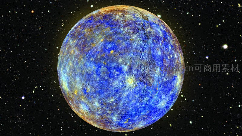 水星表面被渲染成奇幻的蓝色调,布满陨石坑与地质纹理,在繁星背景下显得格外神秘而美丽。
