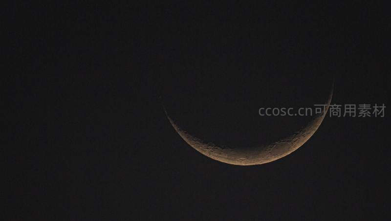 漆黑的夜幕中,一弯纤细的新月静静悬挂,月球表面的环形山隐约可见,散发着清冷而宁静的光辉。