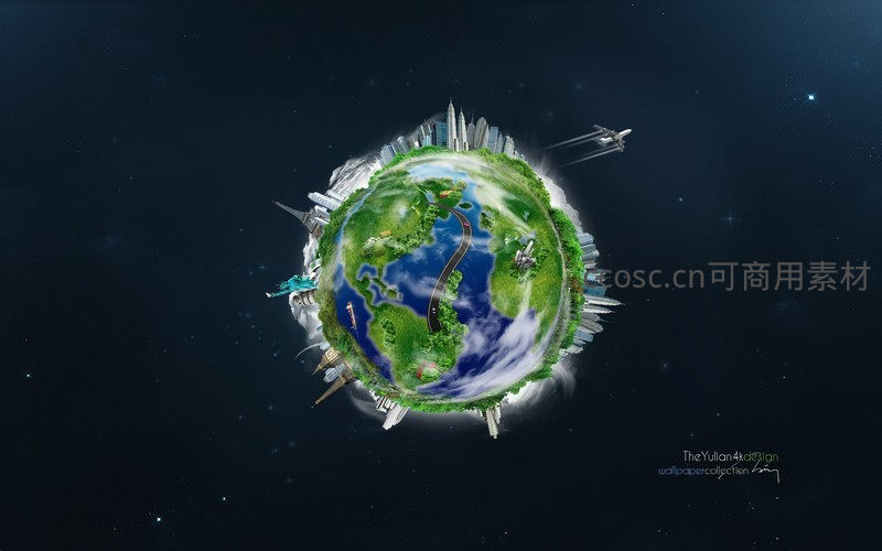 一个充满想象力的地球模型,绿色大陆被现代都市环抱,寓意人类文明与自然生态的共生共荣愿景。