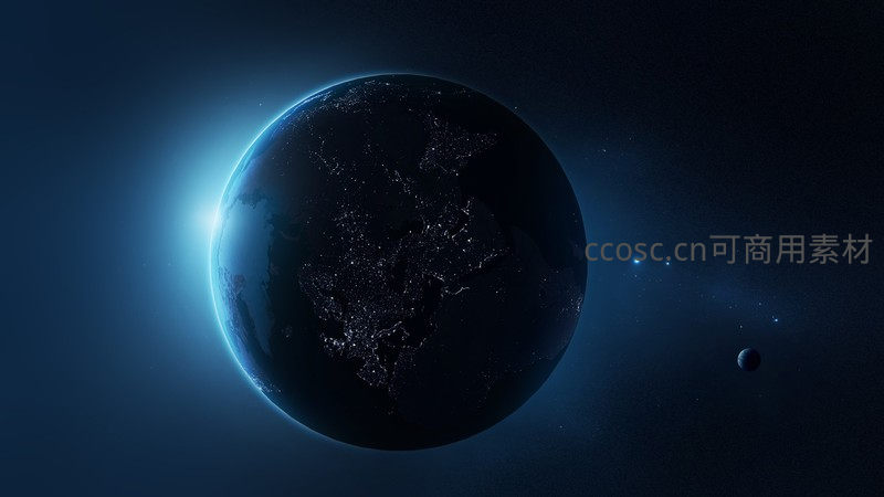 从太空凝视夜晚的地球,亚洲大陆上无数城市灯火如星辰般闪烁,映衬着远方的月球,展现人类文明之光。
