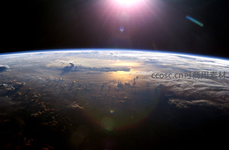 太阳初升,金色光芒洒满地球边缘,云海翻腾,展现宇宙中独一无二的黎明之美,震撼人心。