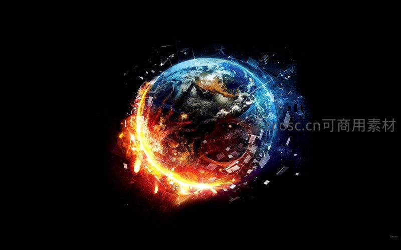 蓝色地球被炽热的橙色火焰与飞散的数字方块环绕,象征科技与自然力量的激烈碰撞。