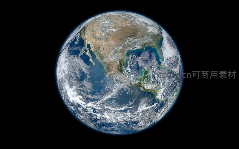 在漆黑宇宙背景下,地球如一颗晶莹剔透的蓝色宝石,北美洲与南美洲清晰可见,云层覆盖广袤海洋。