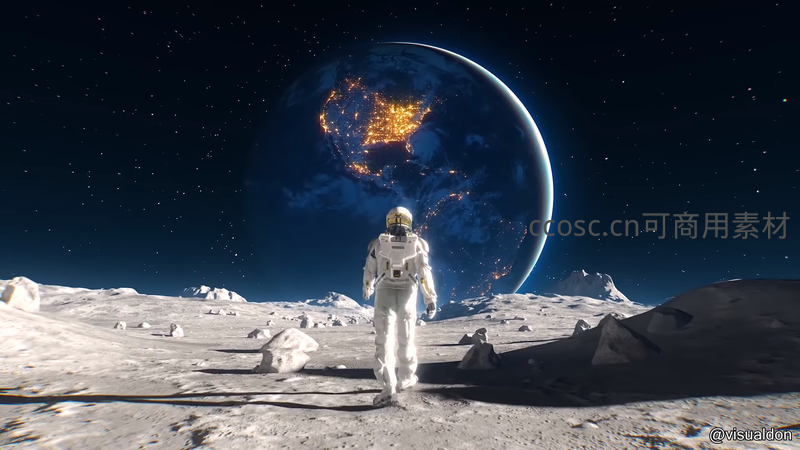 身着白色宇航服的宇航员背对镜头,在月球上行走,前方是布满城市灯火的蔚蓝地球与璀璨星空。