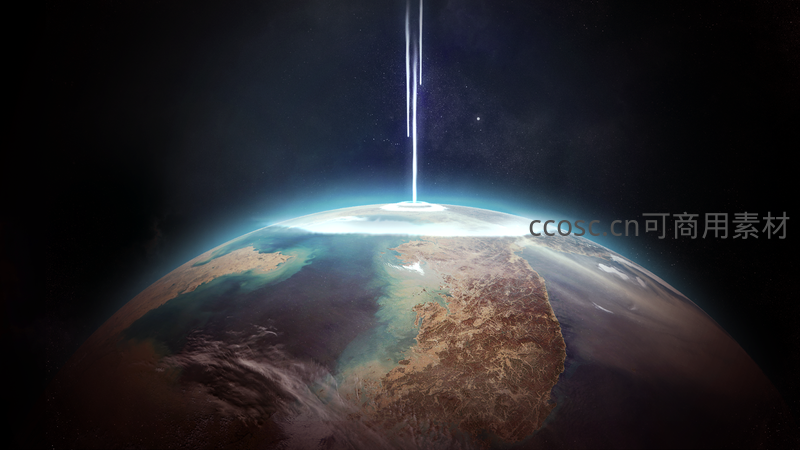 一道耀眼的白色光束从宇宙深处垂直射向地球大气层,照亮了下方大陆轮廓,充满神秘科幻色彩。