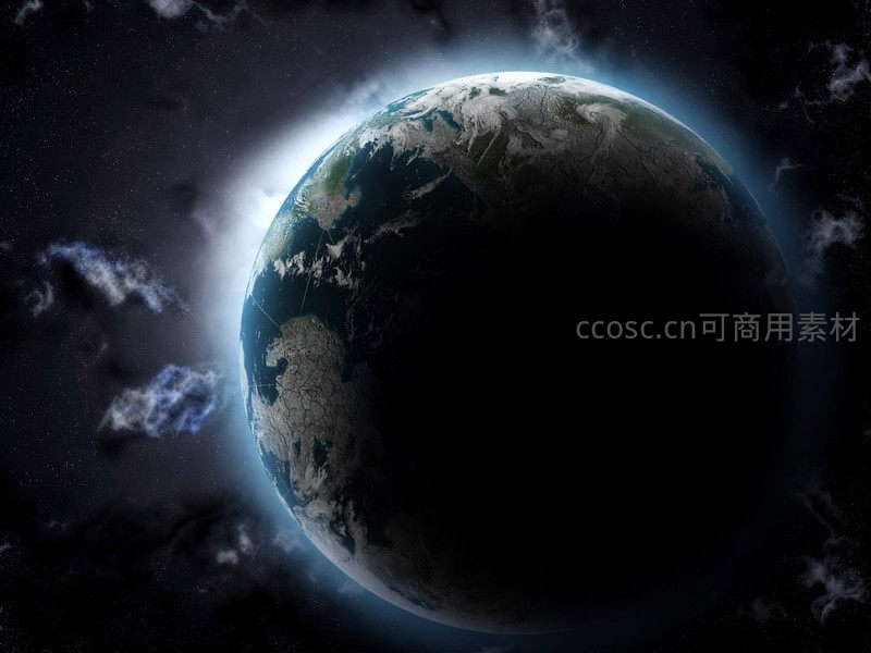 地球在黑暗宇宙中呈现月食般的光影效果,边缘被柔和光辉勾勒,展现星球在宇宙中的静谧与壮美。